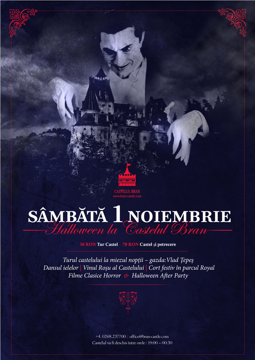 1 noiembrie 2014 va marca un eveniment special la Castelul Bran: începând cu ora 19.00 și până după miezul nopții, la ora 00.30, iubitorii de groazăși mister vor putea să intre în atmosfera unică a unei petreceri de Halloween, între zidurile reci si întunecoase. Legendarul Conte Dracula, țipetele și dansul ielelor vă vor însoți la tot pasul într-un tur de neuitat, tur la finalul căruia veţi avea ocazia de a degusta vinul roşu ca sângele, în Curtea Interioară. Copiii curajoși, însoțiți de cei dragi, vor fi recompensați de Contele Dracula cu bomboane delicioase.